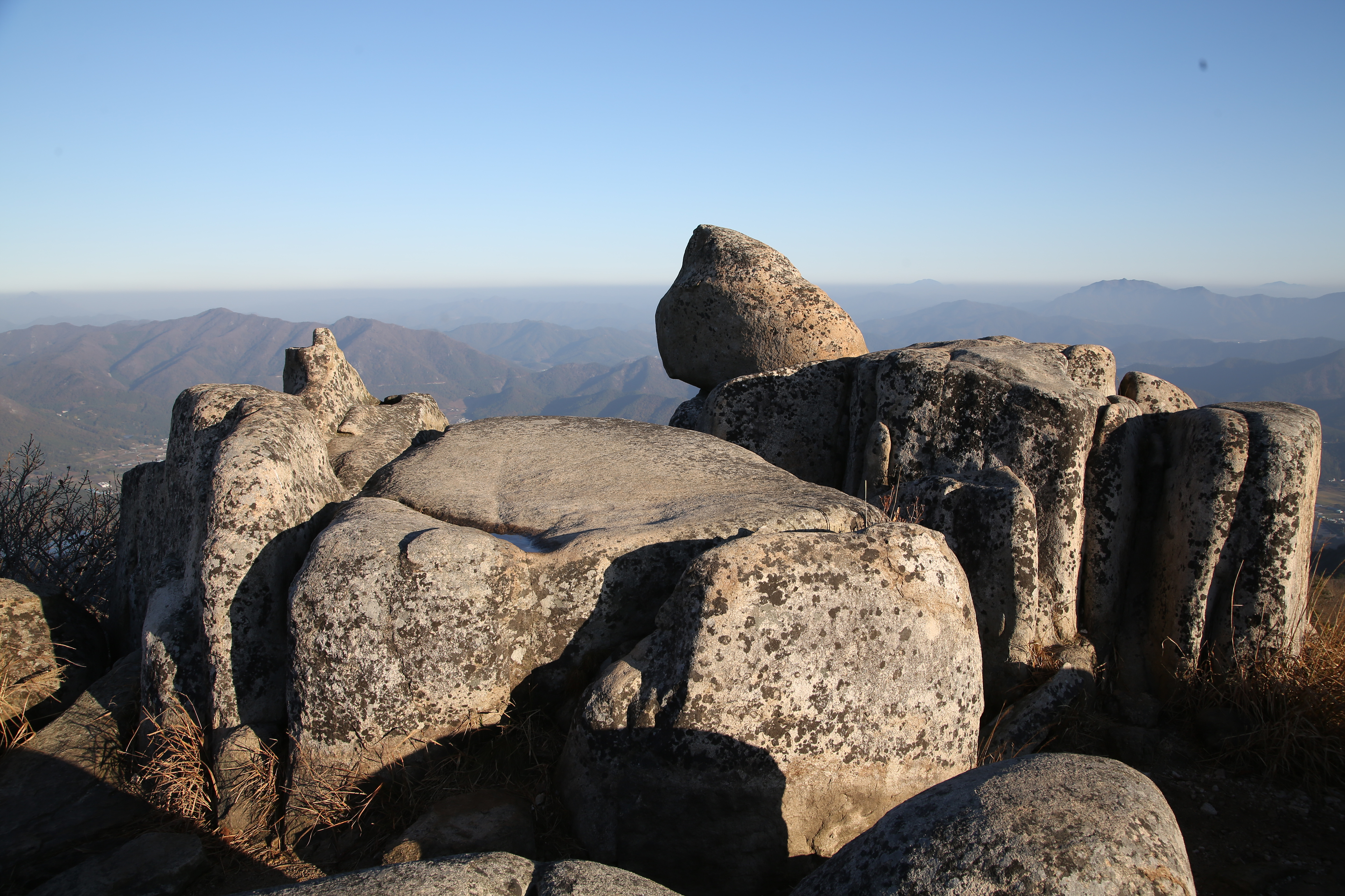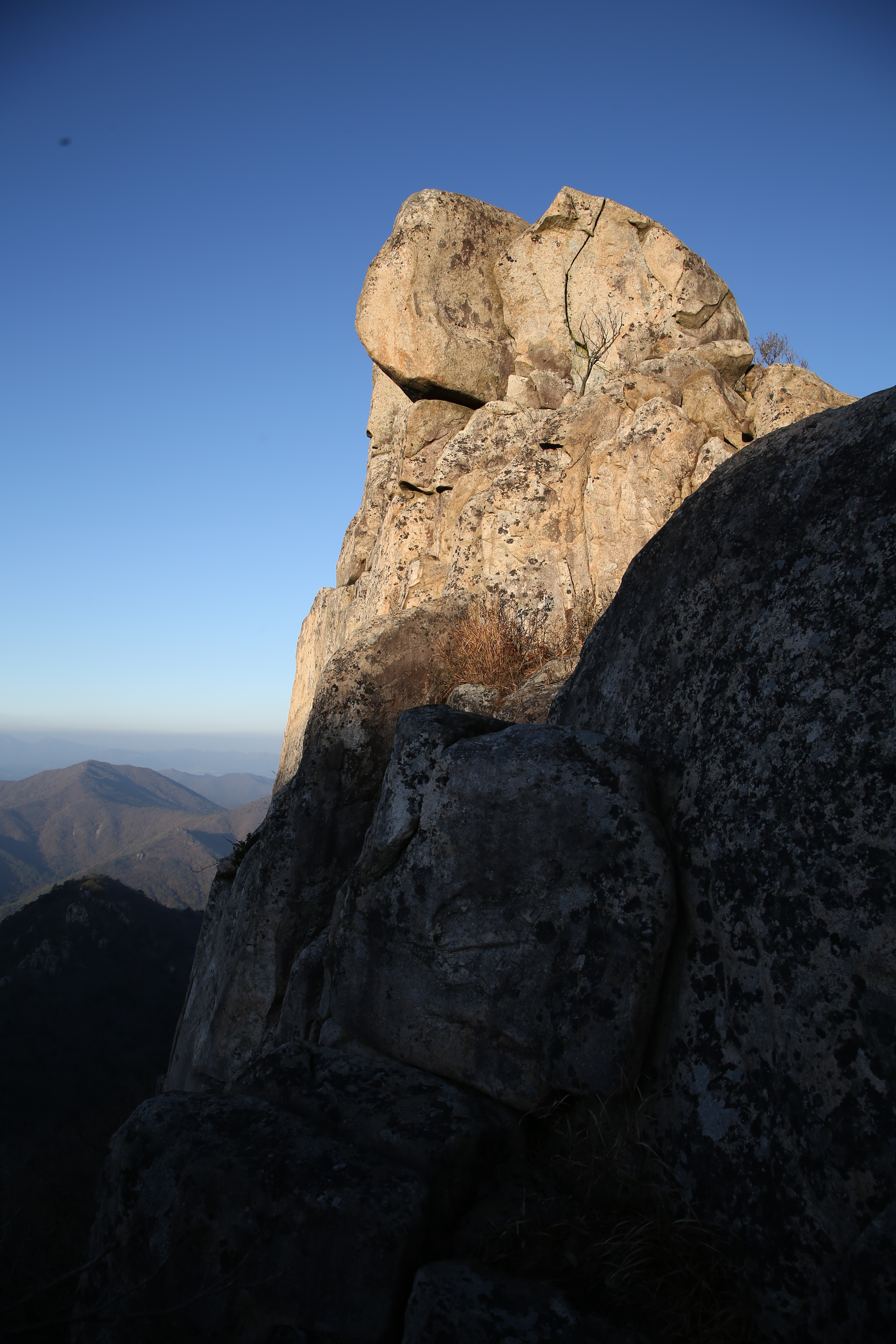 사람 얼굴을 닮은 바위 등 기암괴석이 줄줄이 나온다. 대장봉 환희대에 도착했다. 책처럼 생긴 바위가 둘러선 가운데 책상처럼 반듯하게 깎아놓은 듯한 평평한 바위가 자리 잡고 있다. 여기서 큰 기쁨과 성취감을 맛보라는 의미에서 환희대라고 이름 지은 모양이다. 약간 생뚱맞다. 나라면 책상바위라고 이름 붙였을 것 같다.