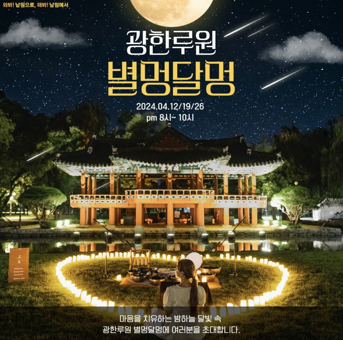 한편, 광한루원 완월정 앞 잔디밭에서 ‘벌멍 달멍’ 프로그램도 운영한다. 4월 12일, 19일, 26일 매주 금요일 저녁 8시부터 10시까지 버스킹 공연, 사운드 테라피, 힐링요가 등을 하며 마음을 치유하며 특별한 추억도 남길 수 있다.