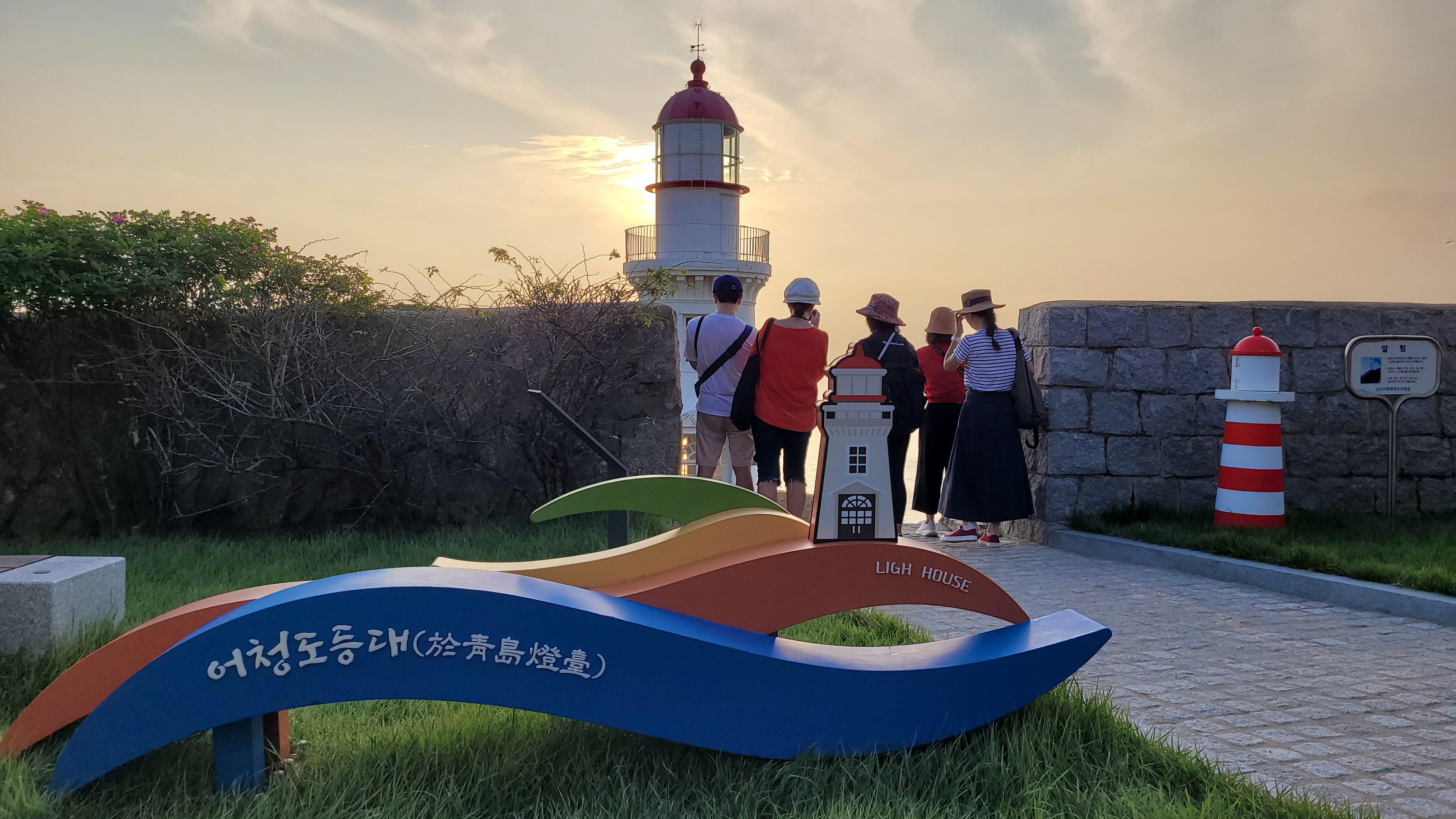 팔각정에서 땀을 식힌 뒤 다시 어청도 등대로 향했다. 어청도 등대는 일제강점기인 1912년 3월에 일본이 대륙진출을 위해 건설한 것으로 군산항과 우리나라 서해안의 남북항로를 오가는 선박들이 이용하는 중요한 등대다. 등탑 상부는 한옥의 서까래 형상을 하고 있고, 둥그런 꽃봉오리같은 빨간색 지붕, 등대를 둘러싼 나지막한 돌담 등 주변 바다 풍경과 잘 어우러진다. 특히 저녁 무렵 흰 등대 넘어 바다로 떨어지는 해넘이가 아름답다. 어청도 등대는 대한민국 근대문화유산으로 등록문화재 제 378호로 지정되어 있다.