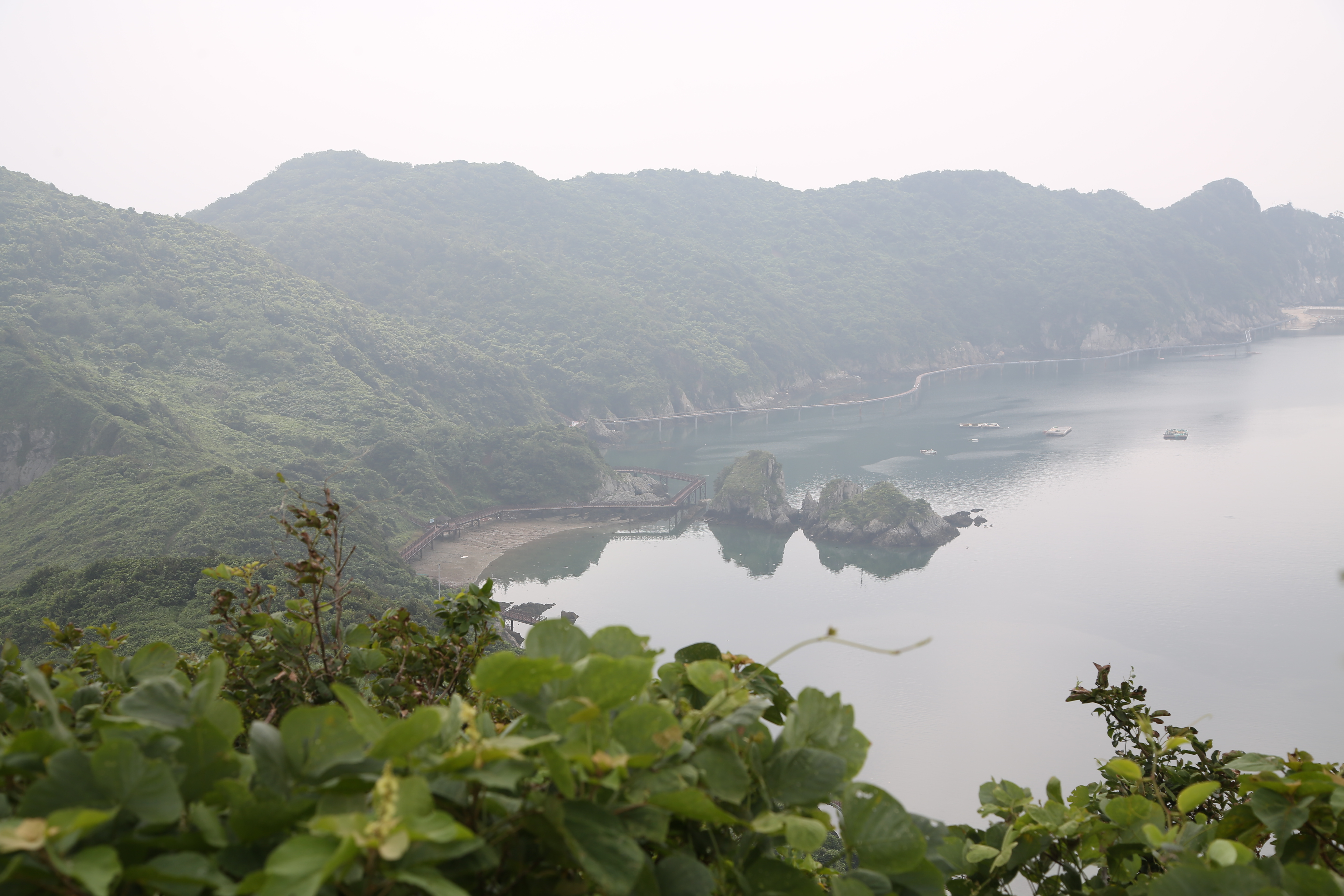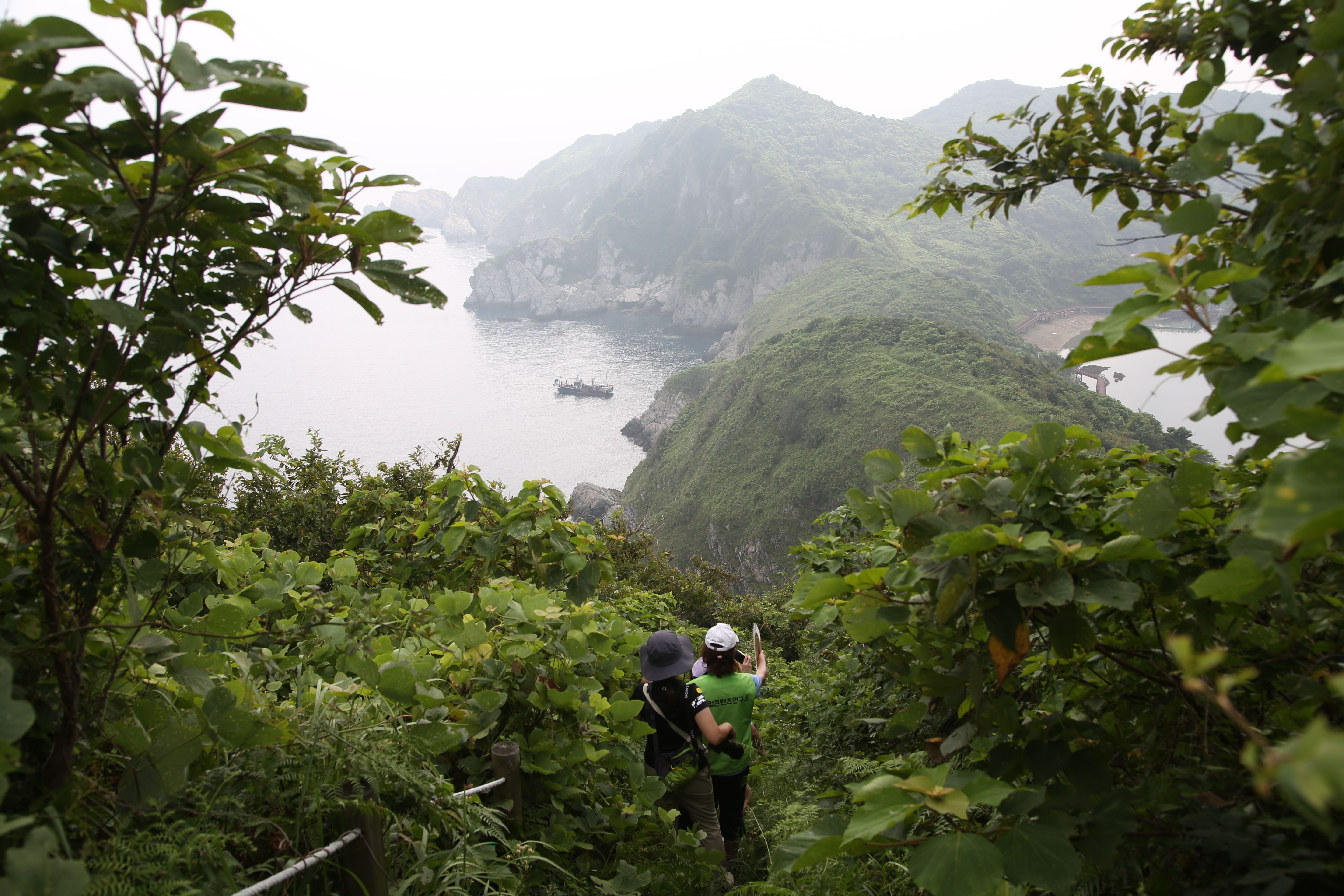 어제 올랐던 팔각정 쉼터가 3코스 안산넘길의 시작점이다. 오늘은 공치산 방향으로 내려간다. 날씨가 너무 무더워 온몸이 땀으로 흠뻑 젖었다. 오늘은 안개까지 끼어 전망이 좋지 않다. 키까지 웃자란 숲에 땅엔 덩굴이 무성해 자꾸만 발목을 잡는다. 공치산 해막넘쉼터를 지나 한반도 지형 관측지라는 안내판까지 오니 안개 속에 희부옇게 마을도 보이고 저 멀리 해안산책길 데크도 보인다. 한반도 지형은 좀 더 높은 곳에서 봐야 온전히 보일 것 같다. 애초 계획은 목넘쉼터를 지나 해안산책길로 길을 잇는 것이었지만 아쉽게도 2코스 해안산책길로 이어지는 데크가 훼손돼 통제를 하는 바람에 목넘쉼터 근처 사잇길로 빠져나와야 했다.