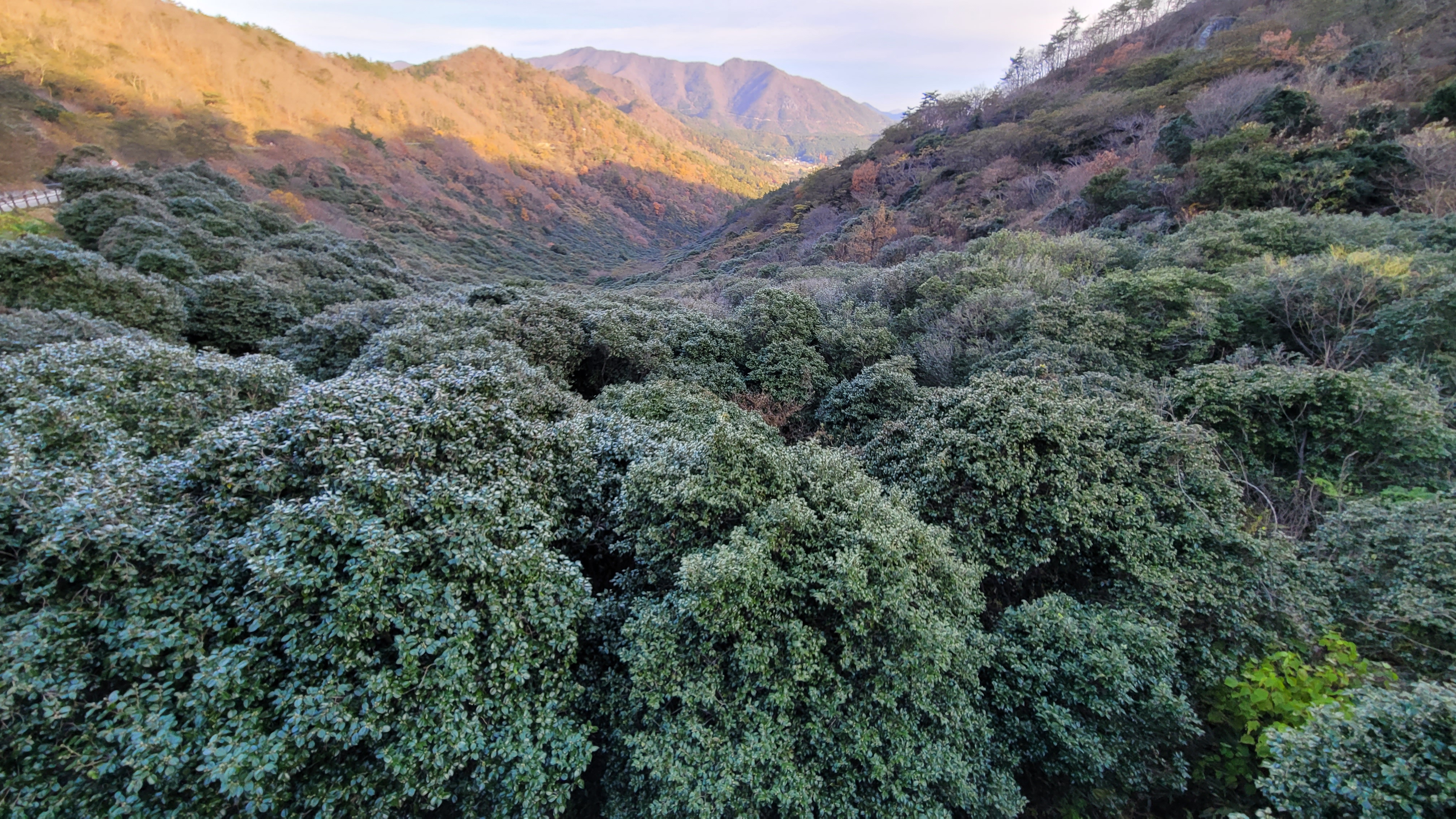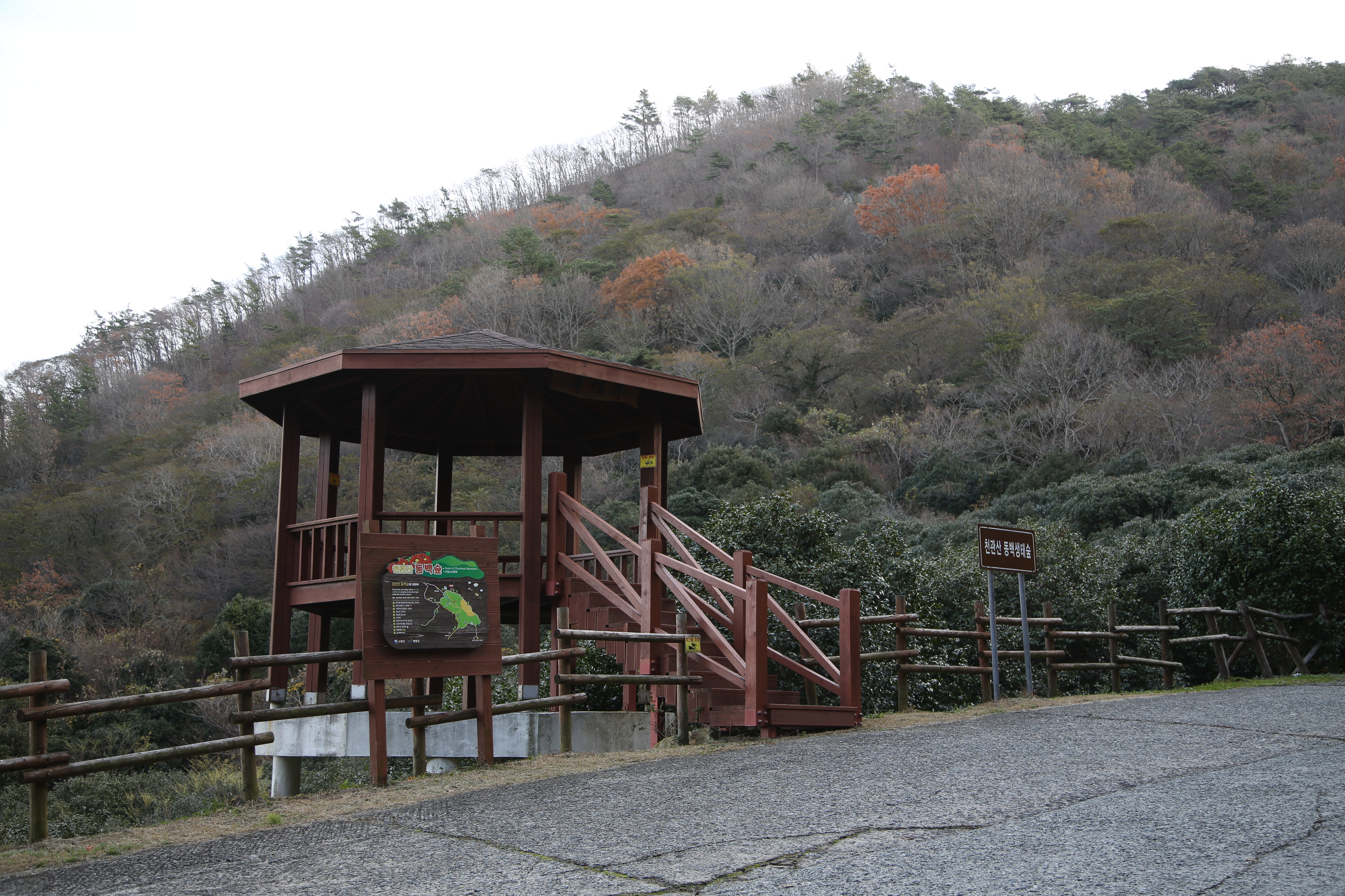 휴양림 들어가는 길에는 우리나라 최대 규모의 동백숲 군락지가 있다. 3월이 되면 온통 붉은 동백꽃으로 덮인다. 정자에 올라가면 동백숲이 한눈에 내려다보이는데, 아직 꽃은 피지 않았지만, 잎이 반들반들한 동백나무가 빽빽하게 들어서 큰 숲을 이루고 있다.
