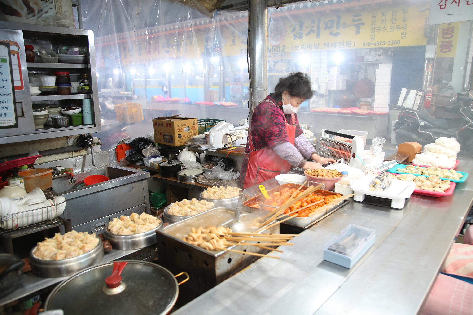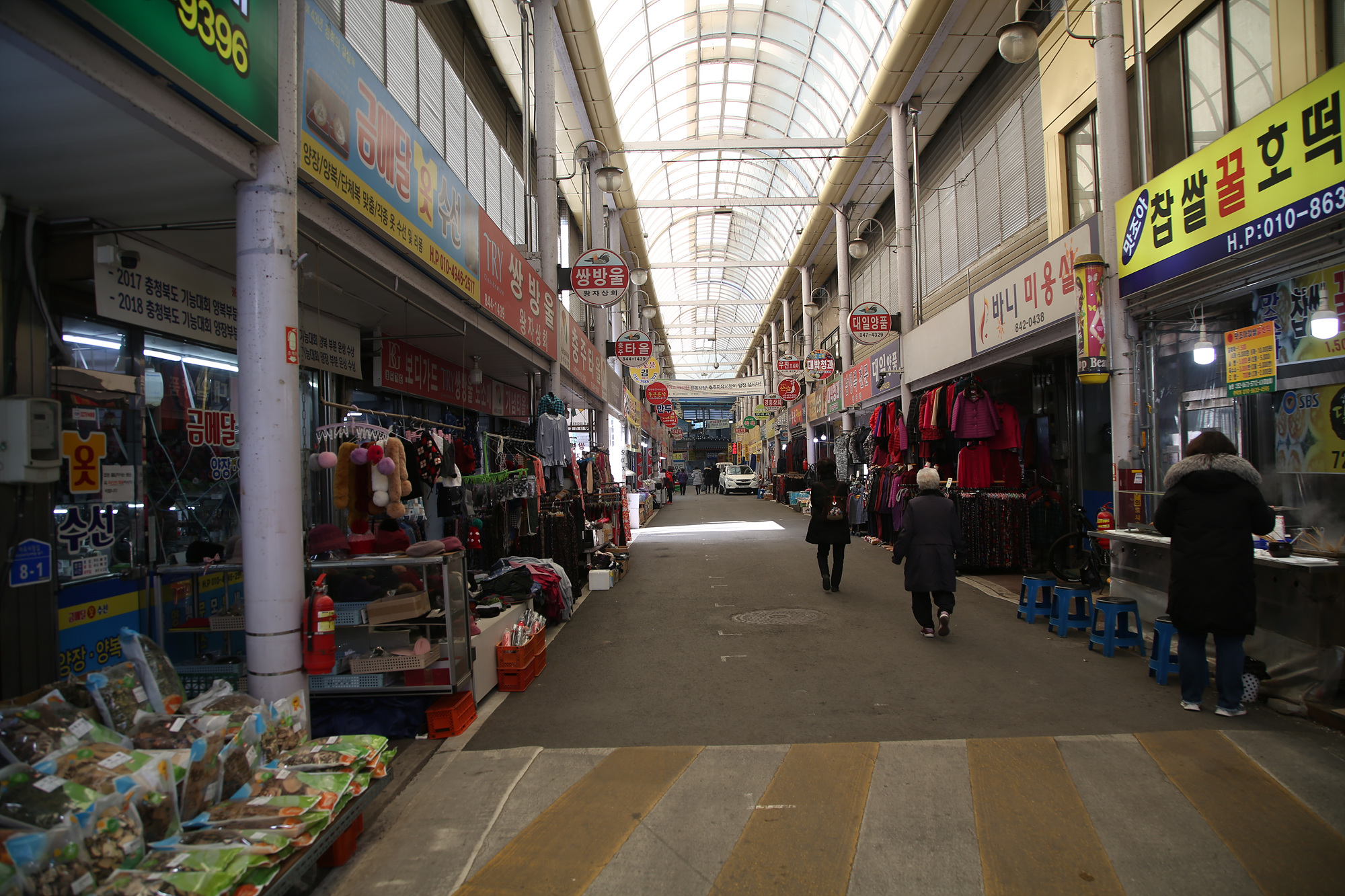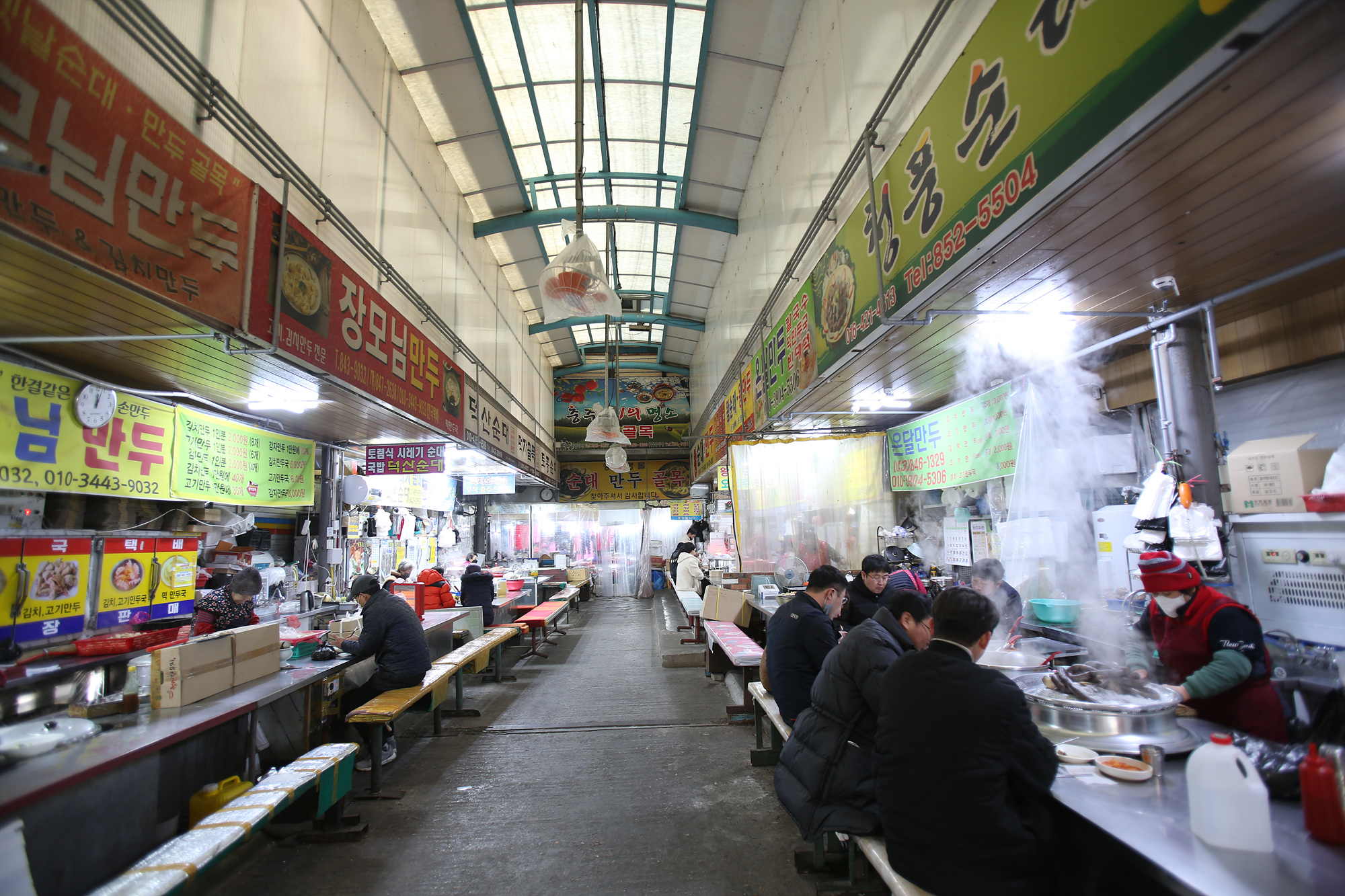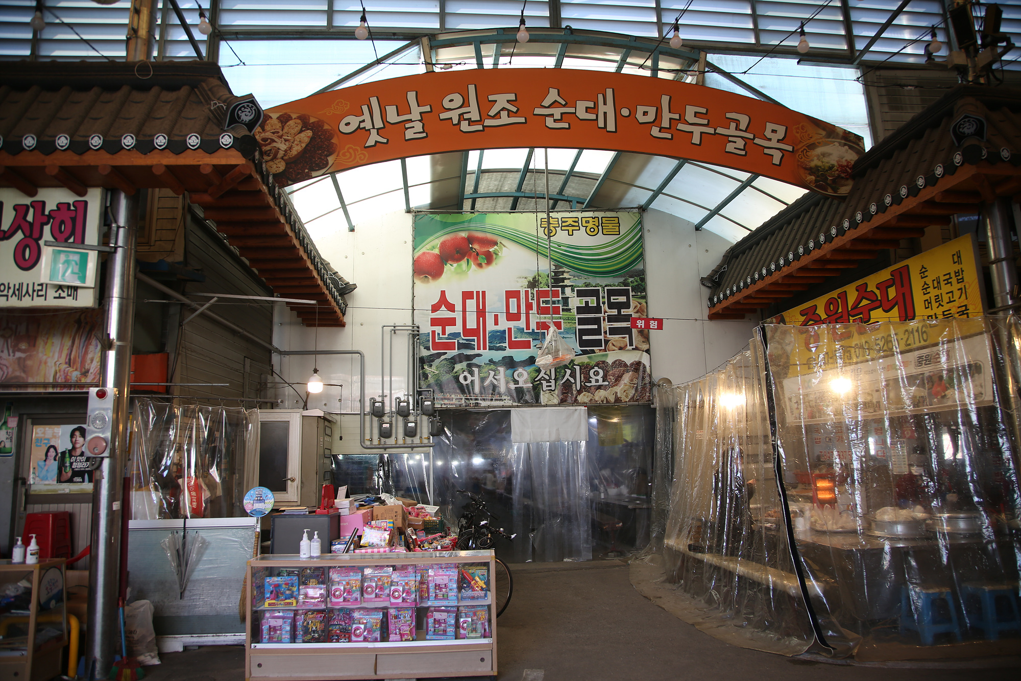 관아골목 투어를 마치고 이번엔 시장투어를 나선다. 관아골에서 걸어서 10여 분 걸으면 충주천을 따라 무학시장, 자유시장, 공설시장이 이어진다. 각각 이름은 다르지만 한 몸처럼 이어진 시장이다. 걷느라 배가 출출해지면 시장에서 먹거리를 찾는다. 많은 음식 중 무얼 택할까? 그중 최고 인기는 자유시장과 무학시장 사이에 자리한 순대·만두 골목이다. 속이 꽉찬 김치만두와 고기만두 그리고 시래기를 듬뿍 넣어 끓인 순댓국을 맛볼 수 있다. 시래기 덕분에 국물이 느끼하지 않고 구수하며 양도 푸짐하다.
