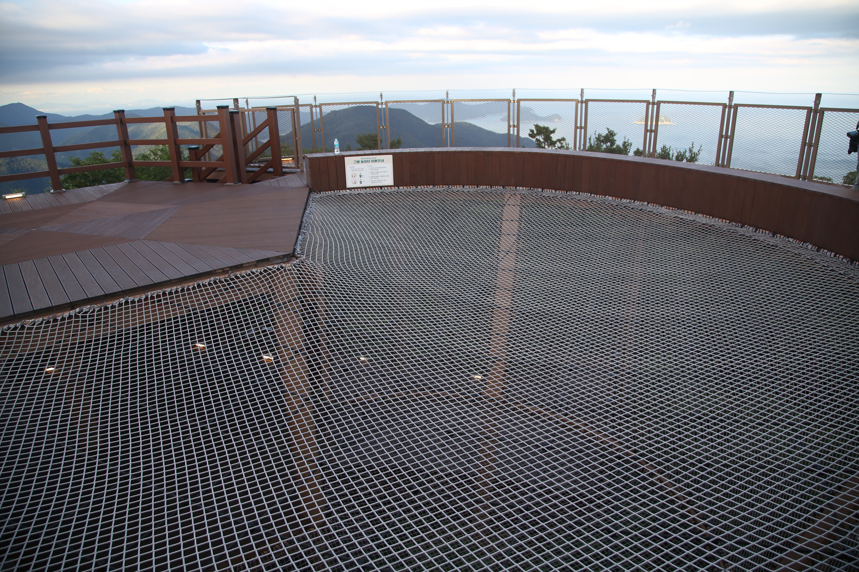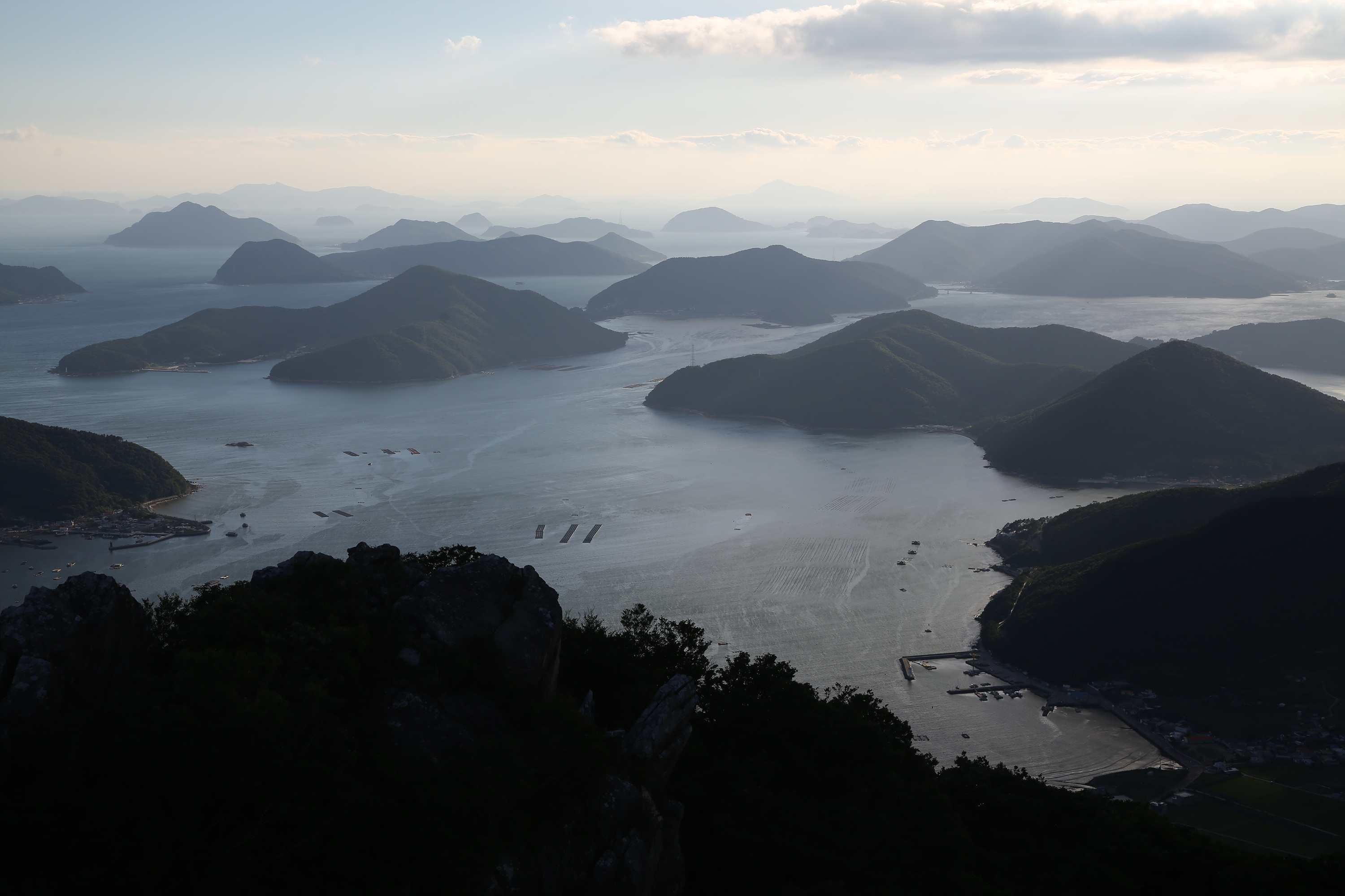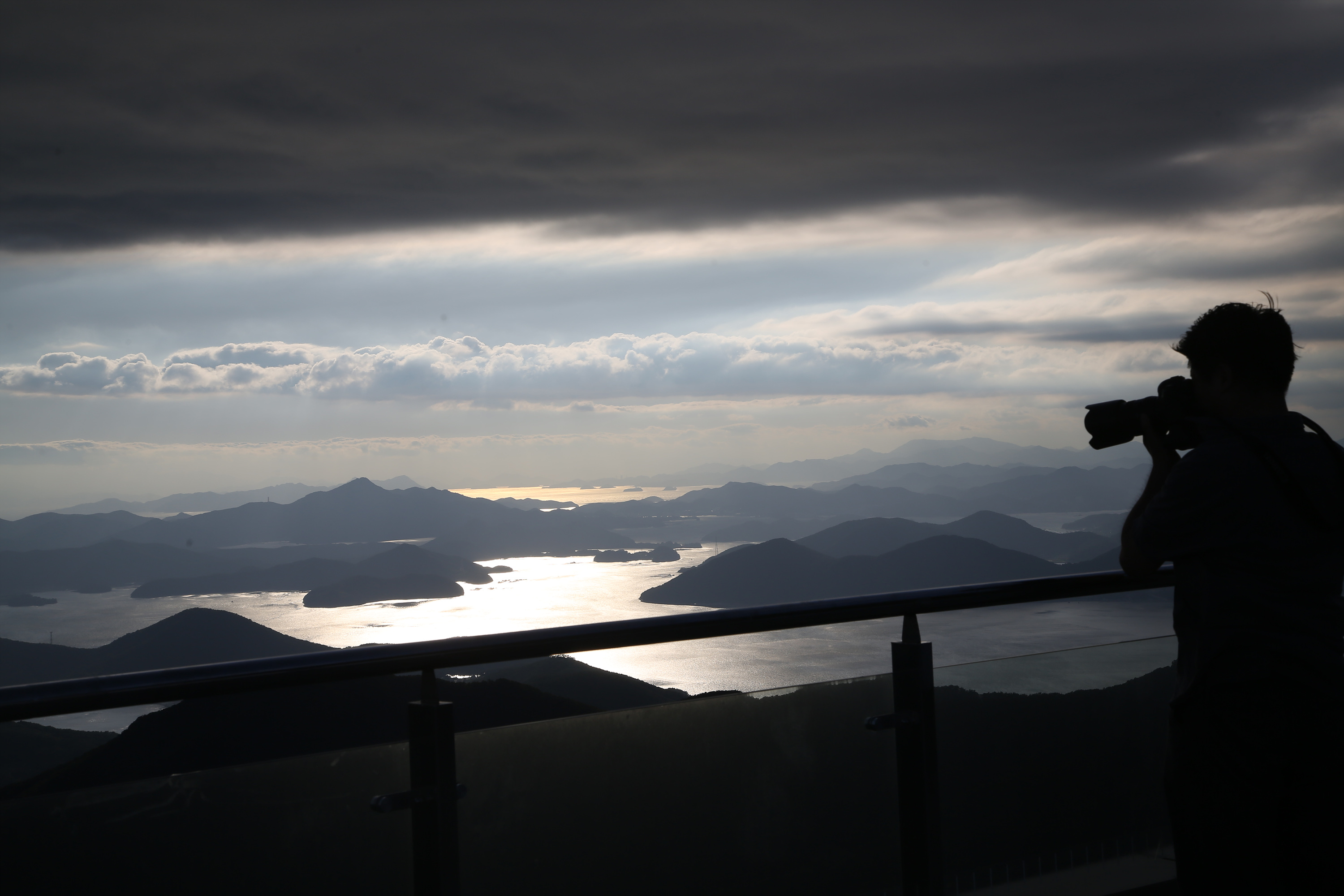 케이블카를 타는 재미가 100점 만점에 80점이라면 케이블카에 내려 노자산 전망대에서 바라보는 풍광은 120점이다. 윤슬정류장에서 내려 5분 정도 걸어 오르면 만나는 전망대에 서면 노자산과 다도해 전망이 아무런 방해 없이 360도 파노라마처럼 펼쳐진다. 케이블카 이름에 왜 파노라마라를 붙였는지 알 것 같다. 거제는 물론 추봉도, 한산도, 매물도까지 보인다. 마치 구름을 타고 위에서 내려다보는 듯하다.