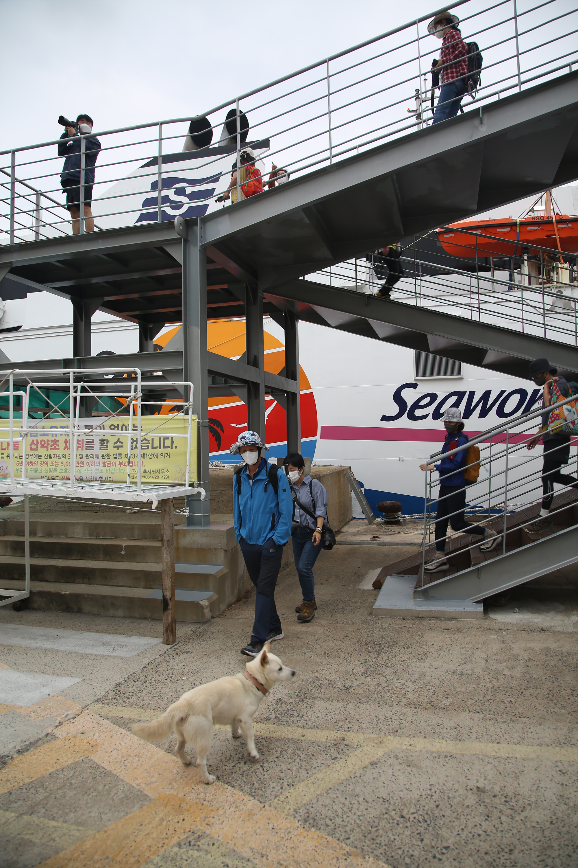 배 타기 전 늘 걱정거리였던 멀미 한번 없이 안락하고 편안한 산타모니카호 첫배를 타고 추자도에 내리니 아침 8시 50분. 배에서 내리는데 웬 강아지 한 마리가 눈에 불을 켜고 배 주변을 이리 뛰고 저리 뛰고 난리다. 가만 보니 주인이 육지로 나갔는데 혹시 이 배를 타고 들어오는가 싶어 뱃소리를 듣고 항구로 마중 나온 것 같다. 혹시라도 주인을 놓칠까 봐 배 위를 올려다보며 짧은 다리로 배 주변을 정신없이 뛰어다녔다. 안타깝게도 주인은 이 배를 타지 않은 듯하다. 저 강아지는 아마도 주인이 올 때까지 뱃소리만 나면 저렇게 항구로 달려 나올 것이다.