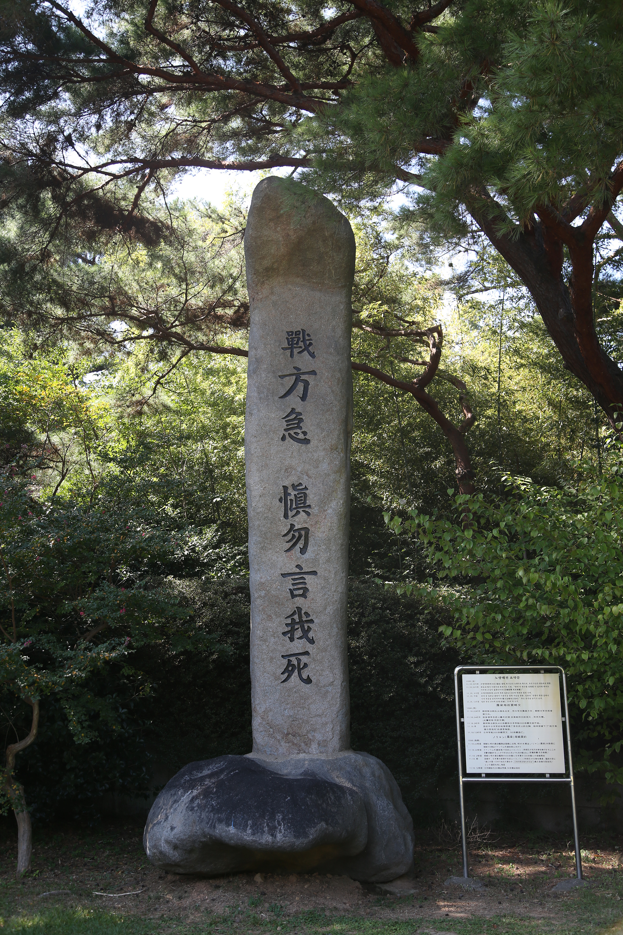 이곳은 장군이 노량해전에서 왜군의 총탄에 맞아 전사한 후 맨 처음 시신을 육지에 내린 곳이기도 하다. 이락사(李落詞)와 조그만 비각과 유허비가 있고, 유허비 뒤편의 소나무숲길을 오르면 첨망대가 있어 노량 앞바다가 가까이 보인다. 이 바다에서 이순신은 도망치는 적을 추격하다 왜구가 쏜 조총에 맞는다. "지금 전쟁이 한창이니 나의 죽음을 알리지 말라" 는 마지막 말을 남기고 숨을 거둔다. 당시 충무공의 나이는 쉰넷.