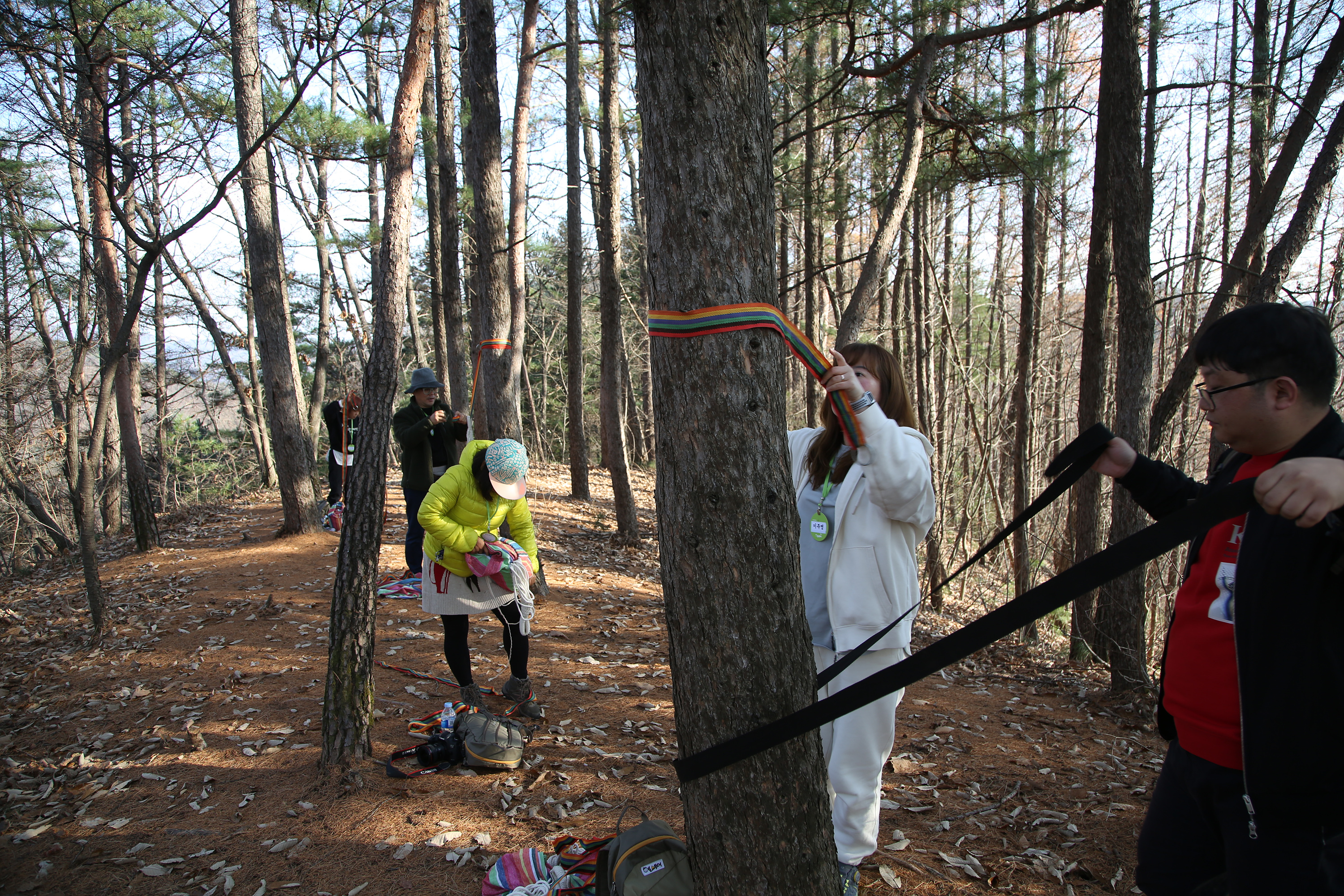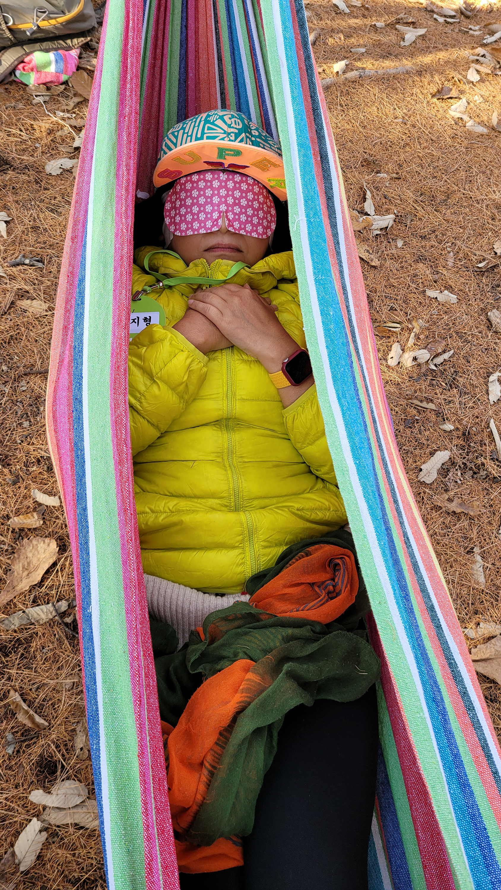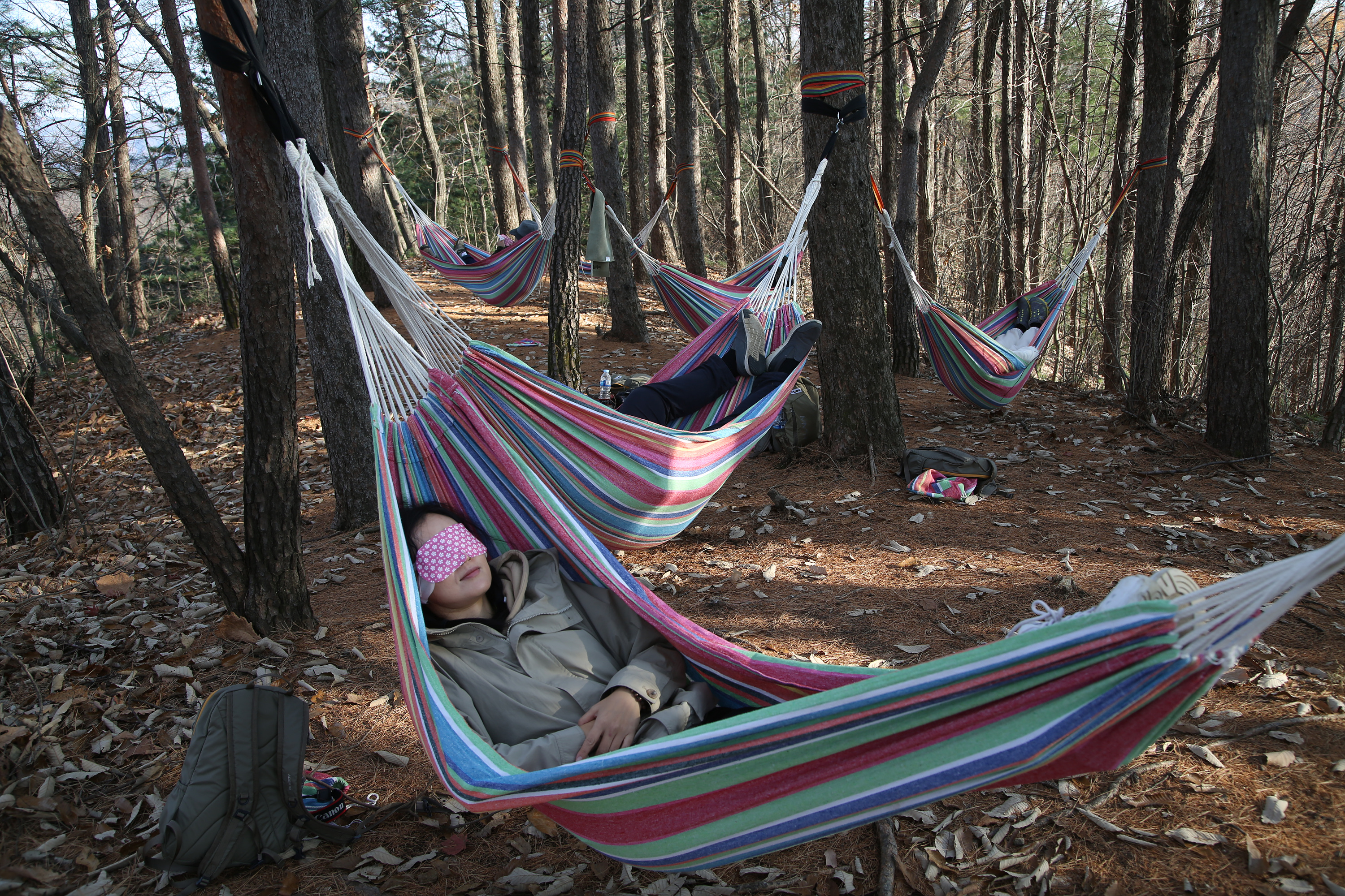 수리산 헬스투어 산행 코스는 일반 등산로가 아닌 투어를 위해 길을 낸 코스여서 한적하고 조용해 그저 산을 천천히 오르는 것만으로도 저절로 힐링이 되는 것 같다. 마침내 수리산 산행의 하이라이트인 긴장완화 프로그램이 시작됐다. 산 중턱까지 올라 나무 사이에 해먹을 설치한 뒤 하늘을 향해 누워 자연과 하나가 되는 것이다. 온열 안대까지 하면 몸과 마음의 긴장이 풀리며 나도 모르게 가볍게 잠까지 든다.